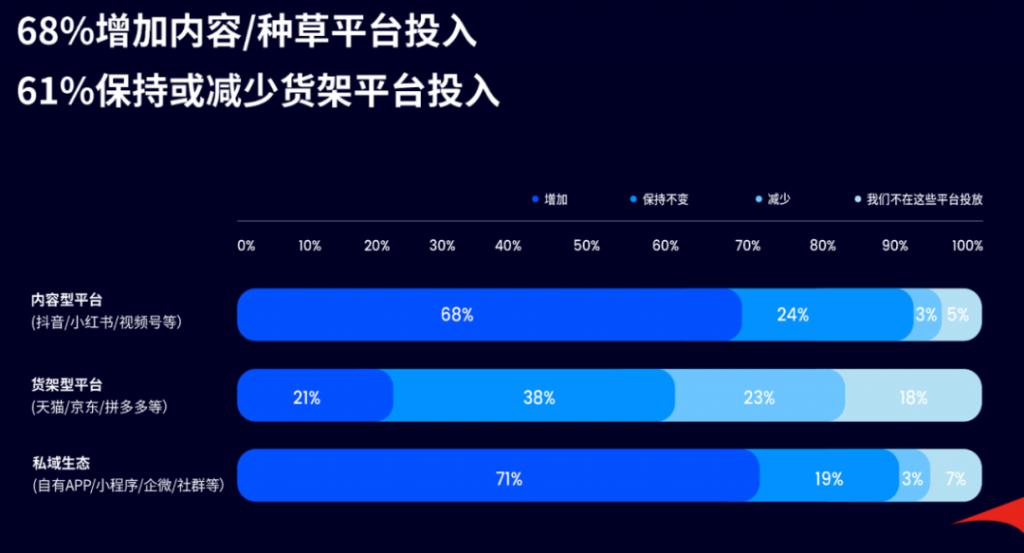 上述白皮书的另一组数据就能说明问题。过去一年,68% 的品牌增加在抖音、小红书、视频号等内容 / 种草平台的投入,而 61% 的品牌则保持或减少天猫、京东、拼多多等货架平台的投入。