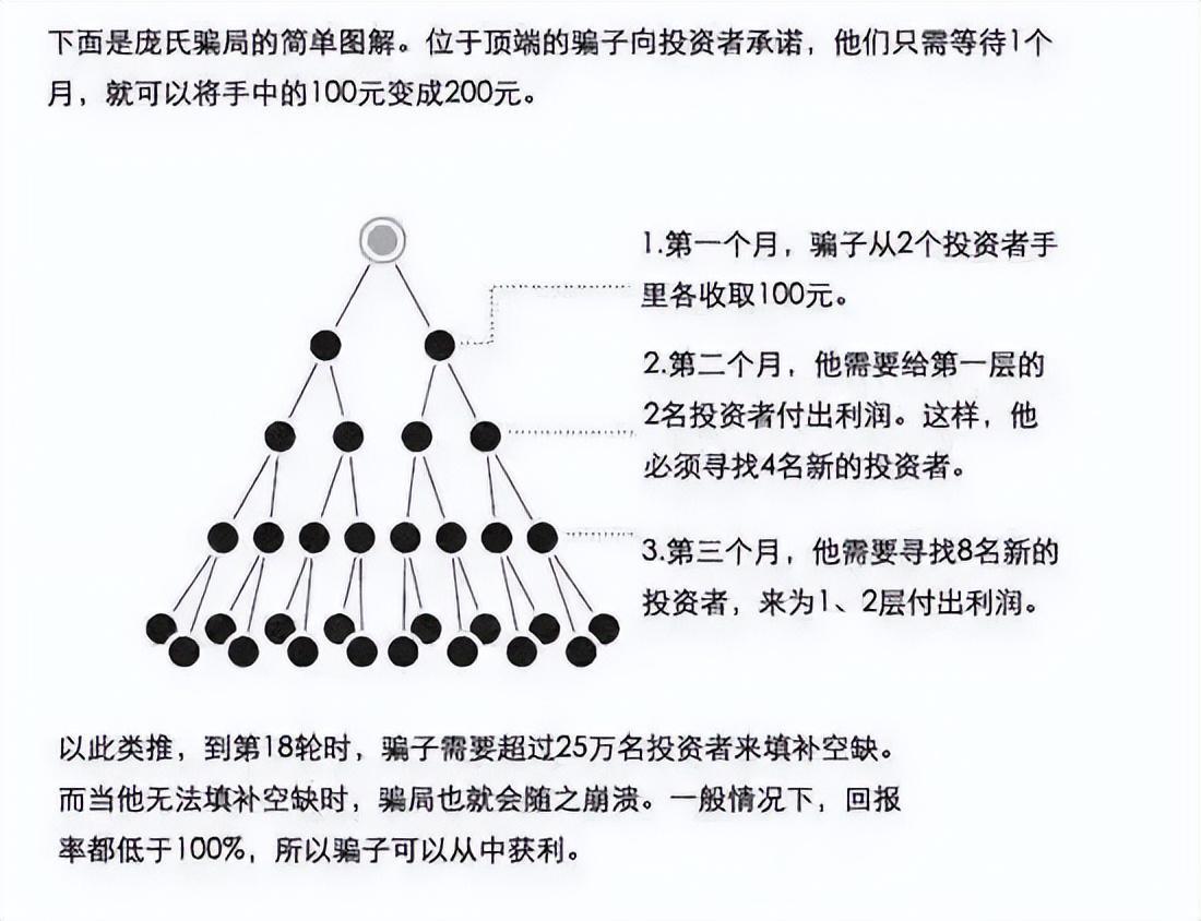 直至后来者越来越少,失去了支付先前回报的能力,他的骗局才被揭发,而这便就是“庞氏骗局”的运作流程。