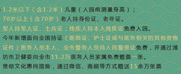 为弘扬“抗疫精神”,向疫情期间战斗在抗疫一线的“抗疫英雄”们致敬,在灯会举办期间,对全市医务人员、警务人员实行免票,并对医务人员家属免费赠票一张。其中,医务人员持医师证、护士证或医务相关的其他资格证件,警务人员持人民警察证,本人不限时间、次数免费入园。并通过潍坊市卫健委向医护家属赠送了共计111770张门票。峡山区还将继续落实文化惠民政策,通过微信活动、商超购物满额等方式向广大群众赠票15万余张。