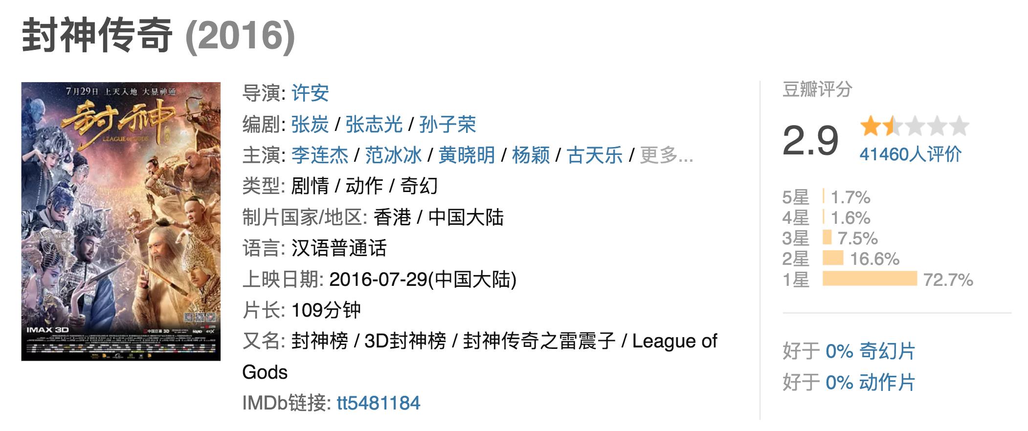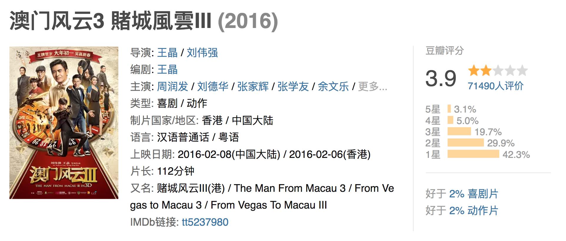反观《祖宗十九代》,观众对于这种相声抖包袱式的搞笑方式,似乎并不买账。更何况与同期的其他几部相比就相形见绌了,如今已经不是《小时代》和《恶棍天使》的时代了。