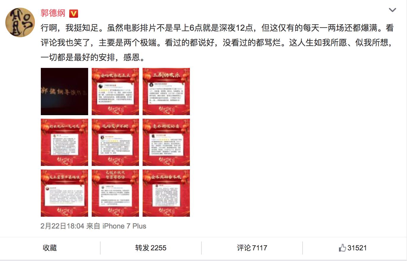 身为执导的郭德纲终于按捺不住了,前几天在微博说明票房惨淡的原因是因为院线排片低。因为排片低且观影时间极度不合理,所以票房低,言外之意就是说电影还是不错的。
