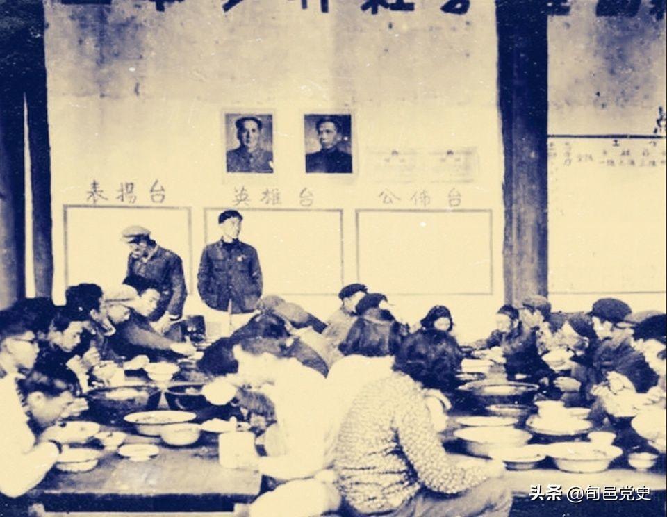 农村公共食堂是"大跃进"运动和人民公社的产物。随着小社并 大社和人民公社化,公共食堂迅速兴起。1958 年夏收后,在"公共食堂是人民公社的心脏"的思想指导下,旬邑县农村大办公共食堂,实行吃饭不要钱的伙食粮食供给制。供应原则是" 有多吃多,有少吃少,有啥吃啥,不浪费"。社员不论家中劳力多少,都能按家庭人口得到免费粮食供应。到 11 月份,全县办起公共食堂 849 个,加人 2.15 万户占全县总农户 90% 以上,人食堂者 11.96 万人,占总人数 92% 以上,基本实现了公共食堂化。每个生产队只办一 个食堂,各户不得起火,全生产队社员挤在一起吃大锅饭。