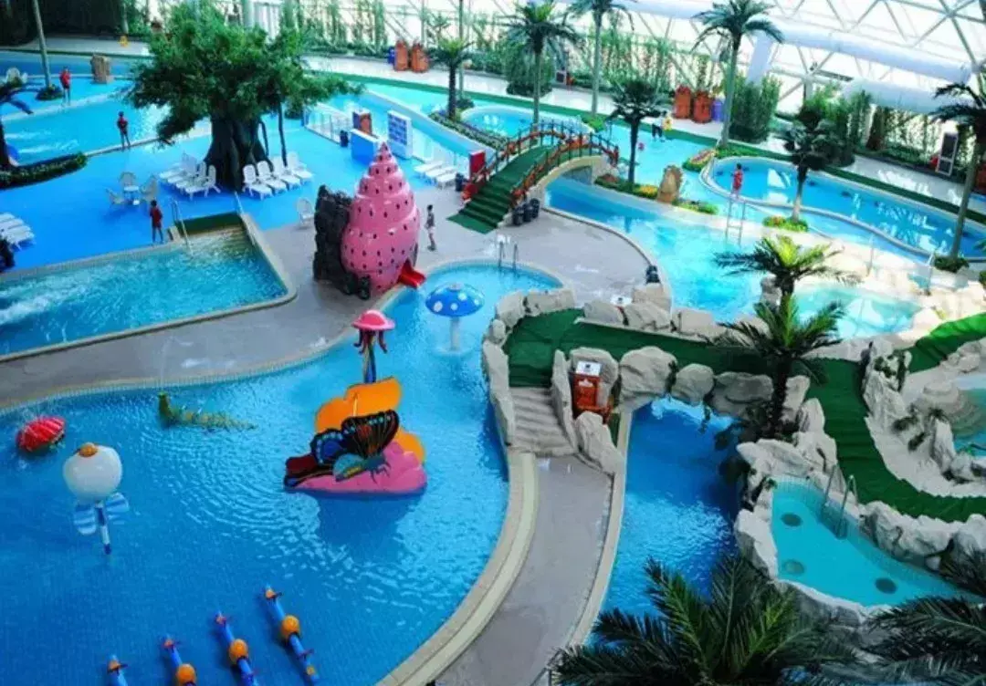 场馆内主要设有戏水大厅、人工造浪、漂流河、冲天竞速滑道、冲天回旋滑道、螺旋滑道、巨碗滑道、、温泉SPA、海战区、儿童戏水池、海盗船、玛雅城堡、各式动植物景观等休闲娱乐健身项目,是集休闲健身、旅游度假、特色餐饮以及全年任何时候都可以游玩的水上欢乐旗舰。