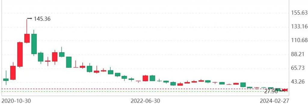 股价连续三年走下坡路的 " 油茅 " 金龙鱼,还没有一丝好转的迹象,2024 年以来又缩水了 3.74%,截至 3 月 1 日收盘报收 32.13 元 / 股,总市值为 1741.96 亿元,与 2021 年的市值最高点相比,蒸发超 6000 亿元。