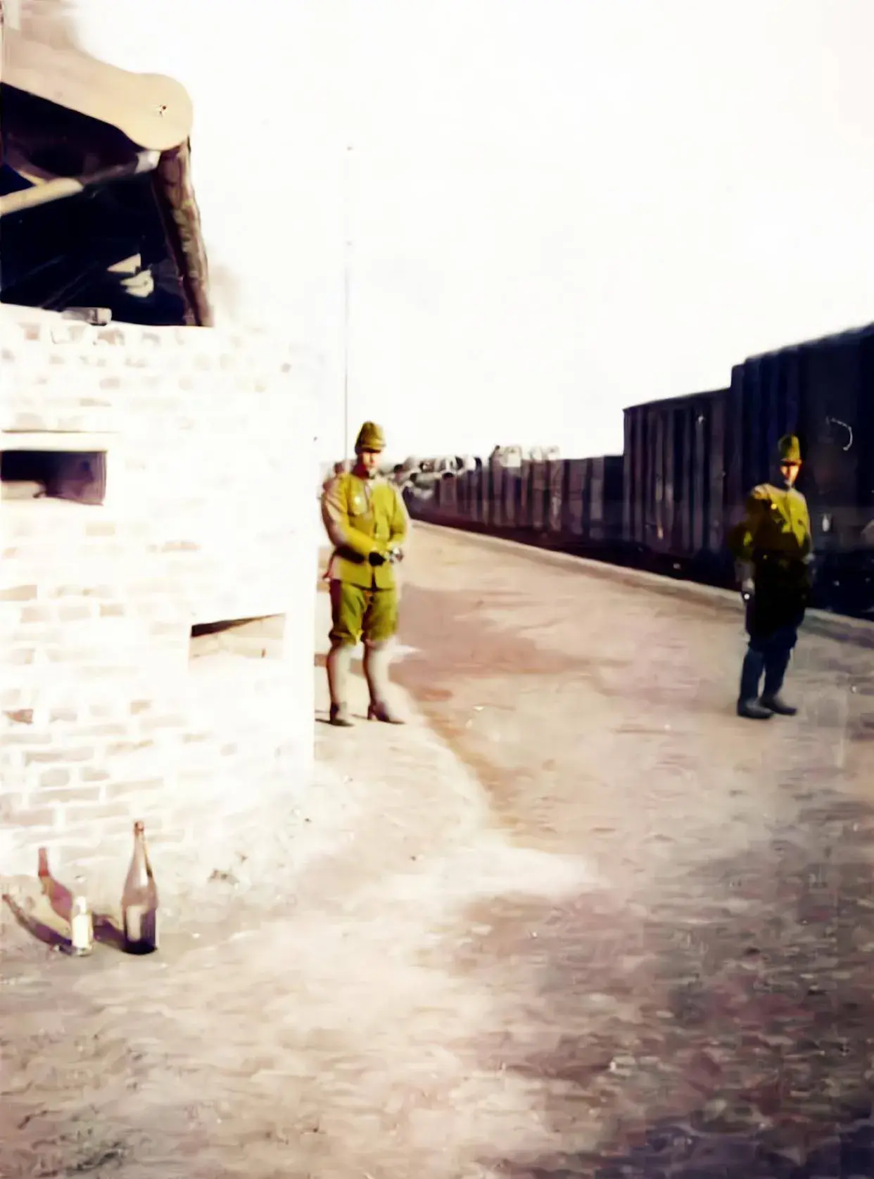 1938年为了防止抗日武装力量的袭击,日本鬼子在商丘火车站俢建了坚固的碉堡。图片为商丘火车站的碉堡,碉堡上面有四个射击孔,两个日本鬼子占在碉堡边上,地上两个空酒瓶子。