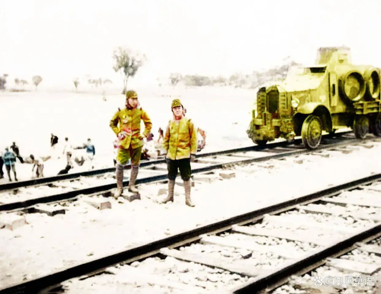 1938年商丘火车站铁路上日本鬼子的装甲车,这是日本鬼子为了防止抗日武装力量破坏铁路专门设计的。两个日本鬼子站在铁轨上,铁路下边有不少老百姓在搬运土方。