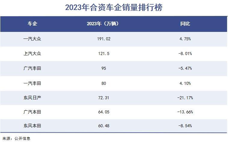 2020 年雷诺集团将其持有东风雷诺 50% 股权转让给东风汽车集团,东风雷诺终止运营;2022 年广汽菲克提出破产申请;2023 年广汽讴歌停产,东风日产累计销量同比下滑 21.17%,成为日系合资车企中同比下滑最严重的。