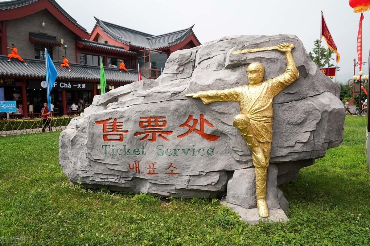 还没进入少林寺,就看到了一尊雕像,雕像是一位老和尚在练功,只见他双手合并,独脚站立,表情庄严,似乎告诉我们少林武功的深奥。向前走了几步就看见了一尊牌坊,上面写着少林寺3个大字,左右两边都是卖刀剑等武器的商店。