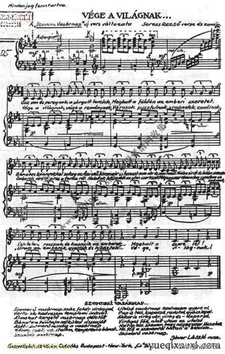 它触摸着你的灵魂,深入你的心灵,对你拉扯、对你咆哮、对你低吟,又像是一个白色的幽灵在古墓丛中滴着冰冷的眼泪,隐隐向你诉苦,刺痛着你的灵魂和心灵……它就是被称作世界三大魔曲之一的《黑色星期天》。