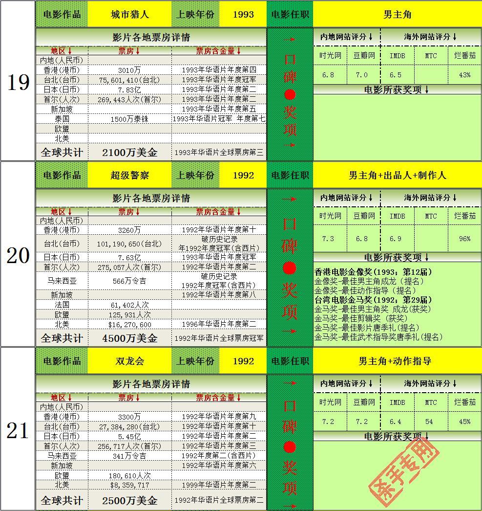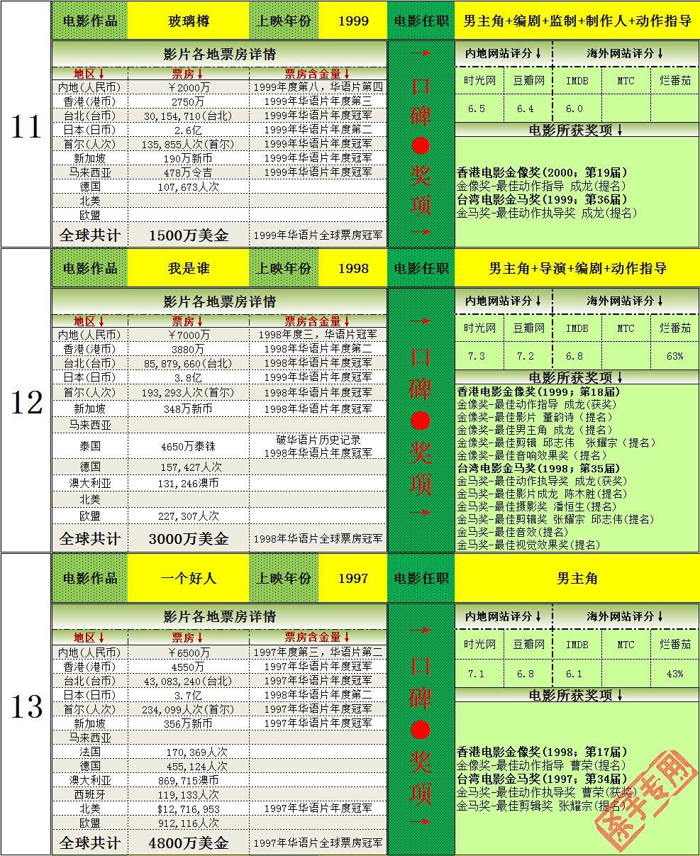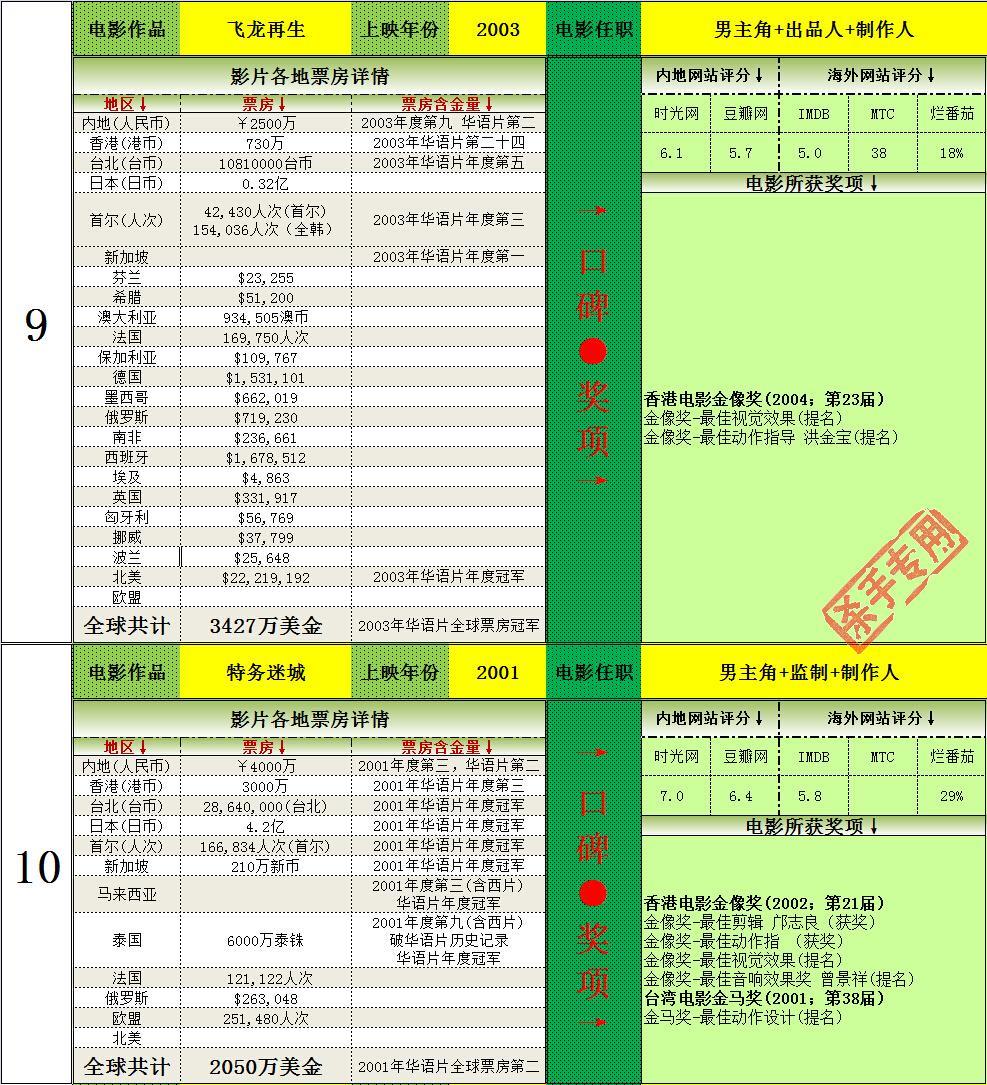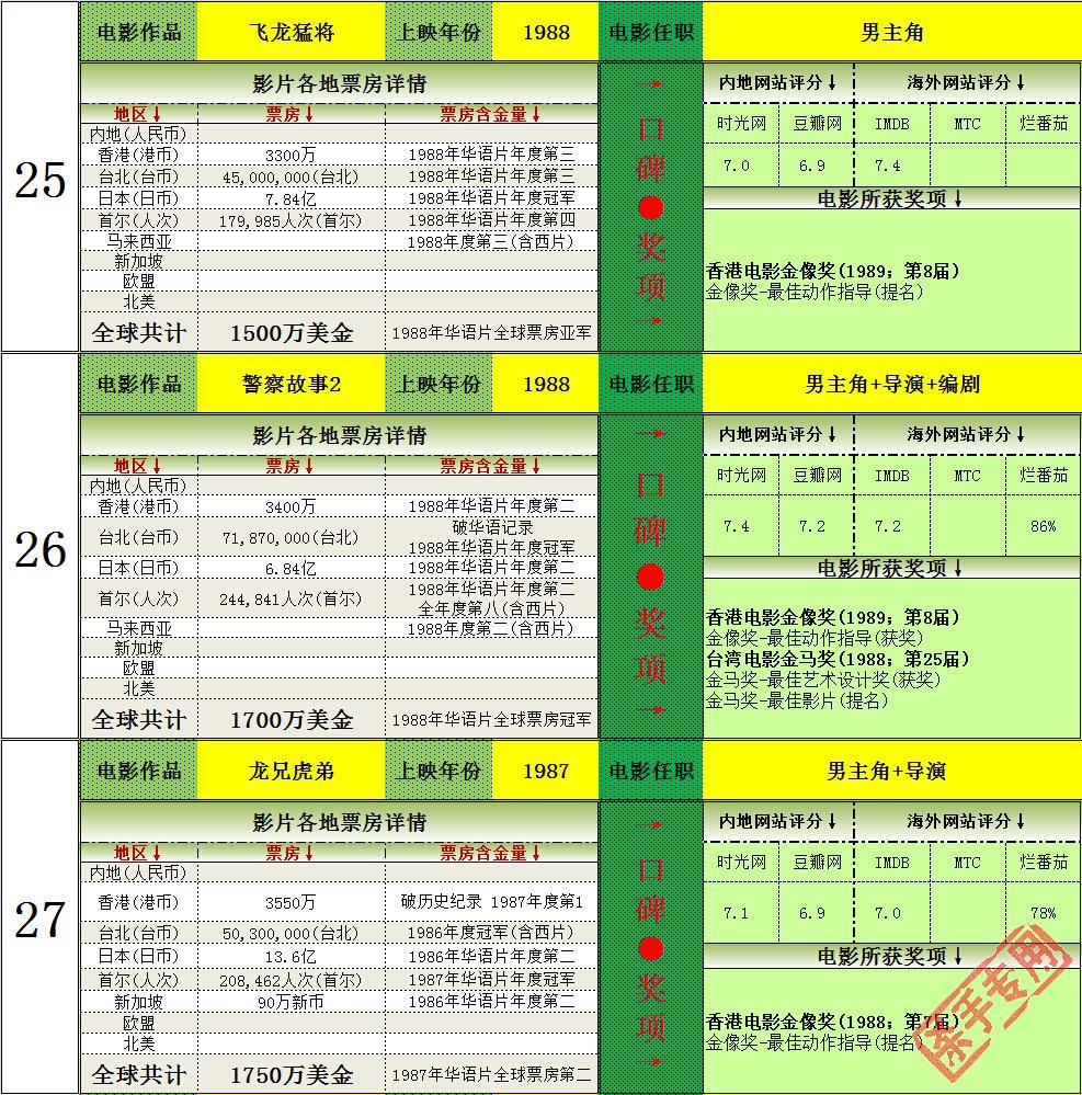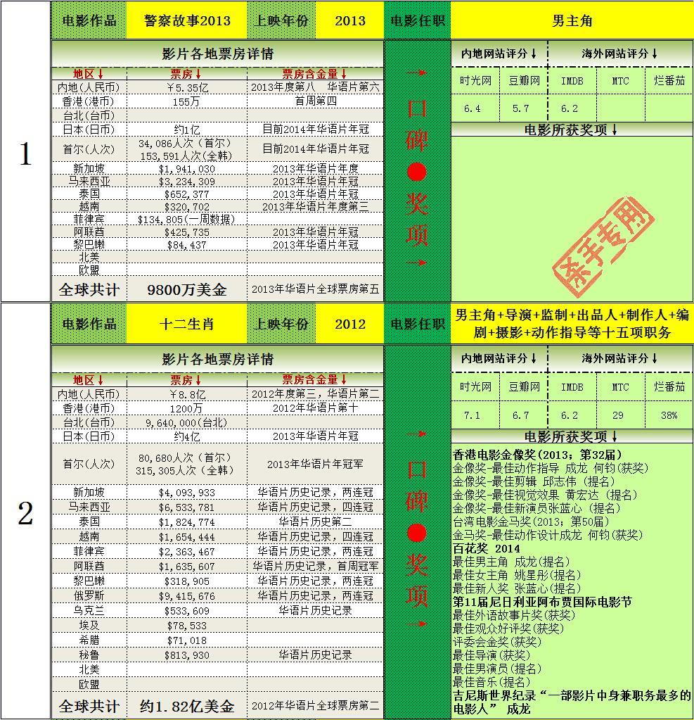 2.打破韩国历史记录一次,14次打入韩国年度排名前十(含西片),获得16次华语年冠(目前警察故事2013为2014年华语片年冠,加上的话17次),均为华人第一。