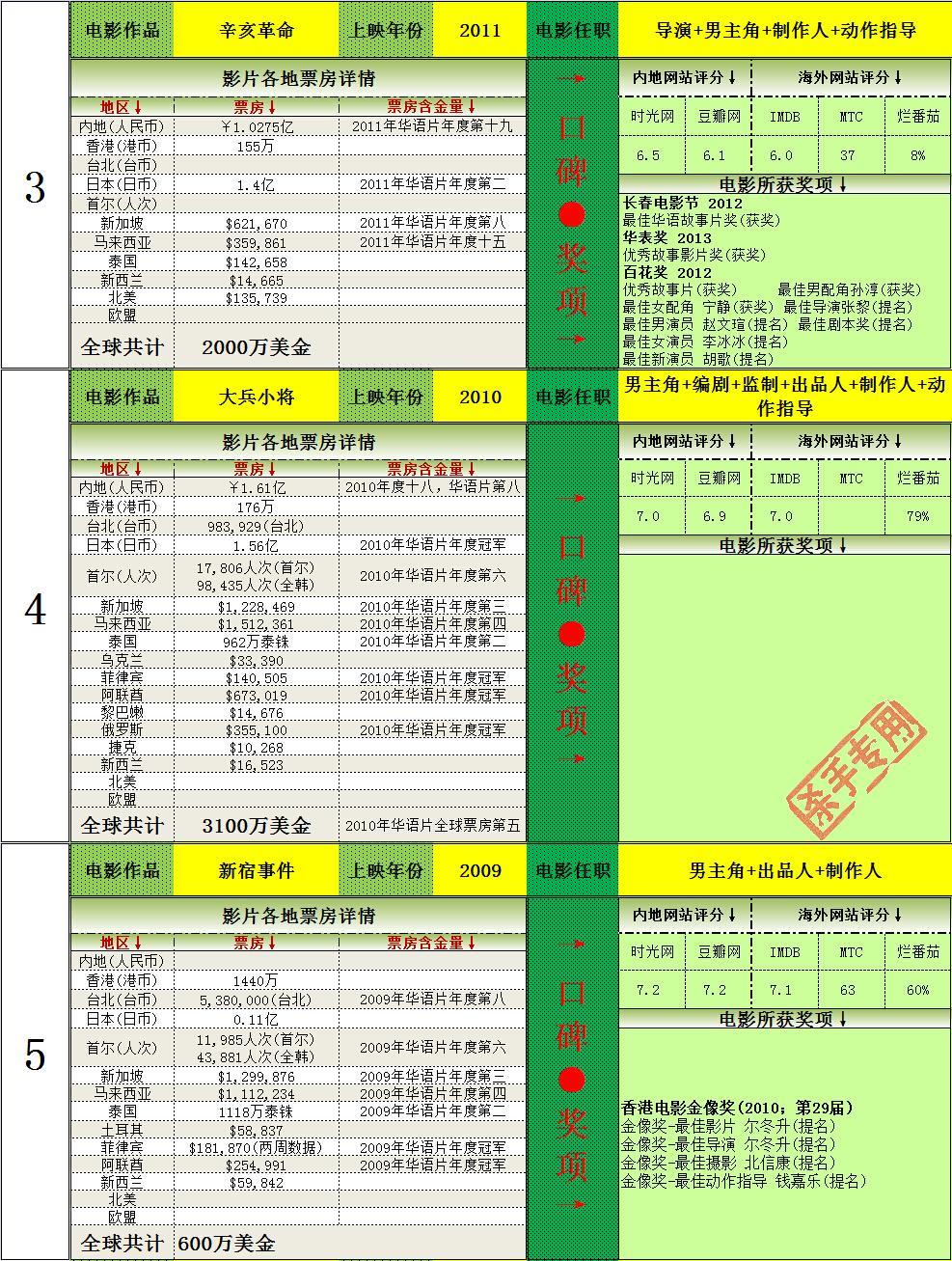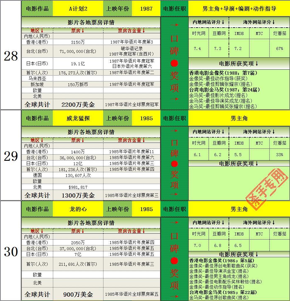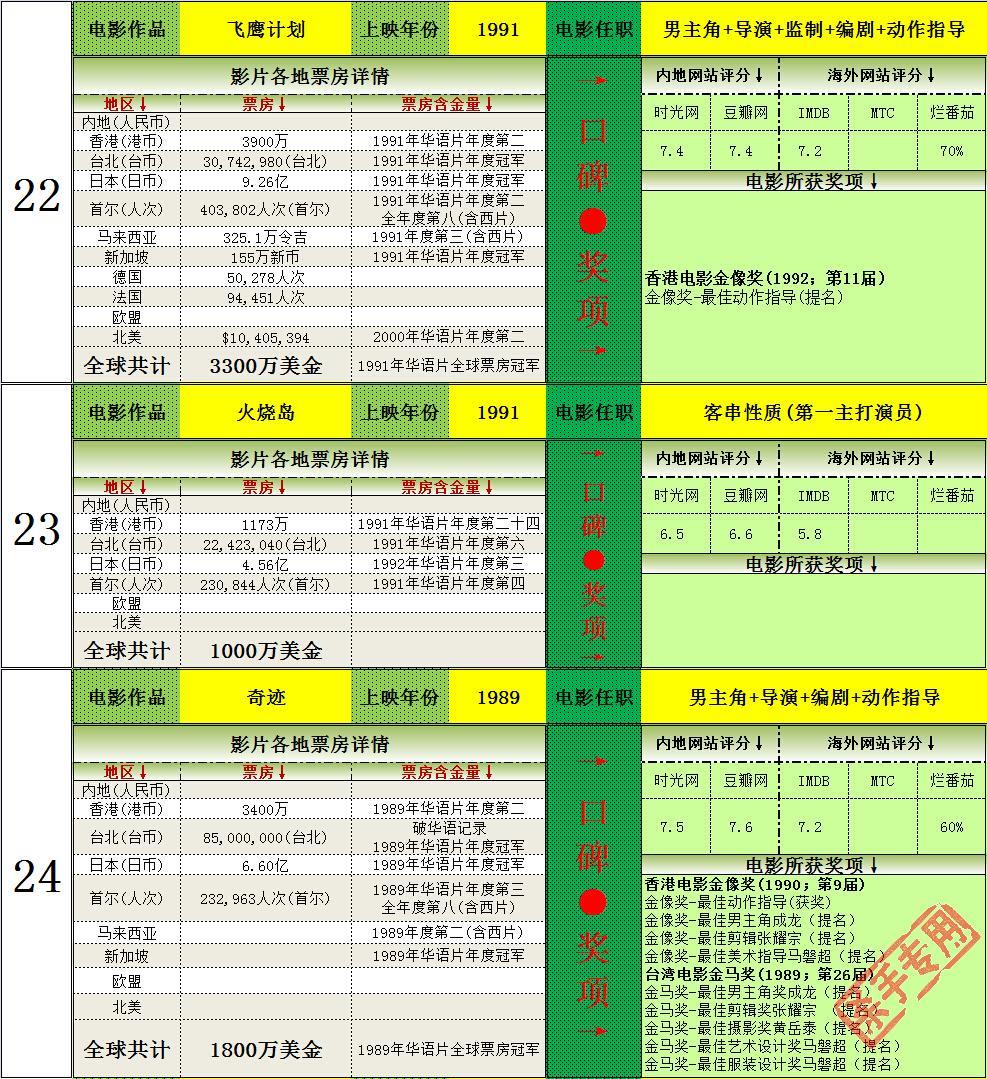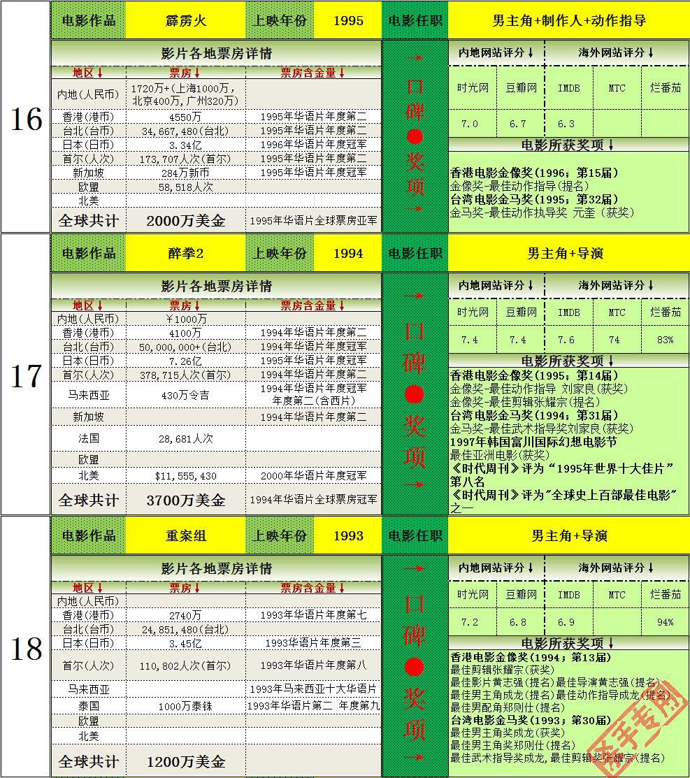 2.打破韩国历史记录一次,14次打入韩国年度排名前十(含西片),获得16次华语年冠(目前警察故事2013为2014年华语片年冠,加上的话17次),均为华人第一。