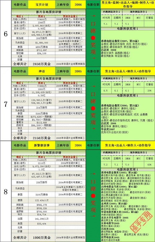 2.其中9部华语片累计约1780万美金们平均约198万美金。其中8次获得华语片年冠,华人第一。