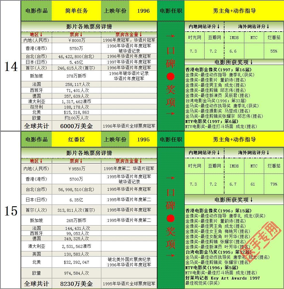 3.有11次杀入年度外语片前十,19次获得华语片年冠,均为华人第一。