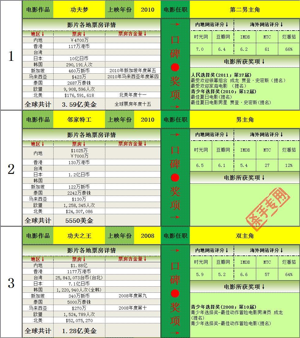 成龙全球电影票房统计(1978-2013)