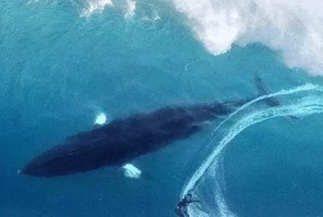 冲浪是一项很刺激的运动,然而你永远不知道你背后的浪当中有什么,如果你突然回头看见这么一个庞然大物,会不会被吓到呢?