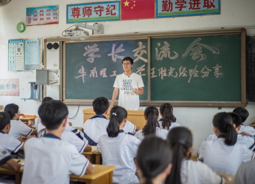 “大家好,我叫王胜光,来自黄略村,也在黄略村长大,今天回到故乡做这个分享会,感到格外亲切,也十分紧张” 。 入秋后的湛江市遂溪县黄略镇黄略村微风徐徐、气候宜人,黄略中学一间课室里,一名身穿白色T桖、戴着黑框眼镜的大男孩王胜光正在为初中毕业班的同学们做分享会。
