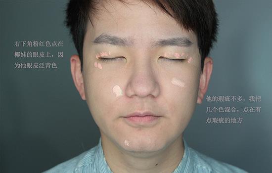 选择一盘多色遮瑕盘,粉色点在泛的位置,深肤色点涂在痘痘,绿色点在泛红的位置,橘色用来遮盖黑眼圈。等上完后,用海绵蛋轻轻地按压开,等遮瑕上完后,再一次用蜜粉轻轻扫一遍定妆。