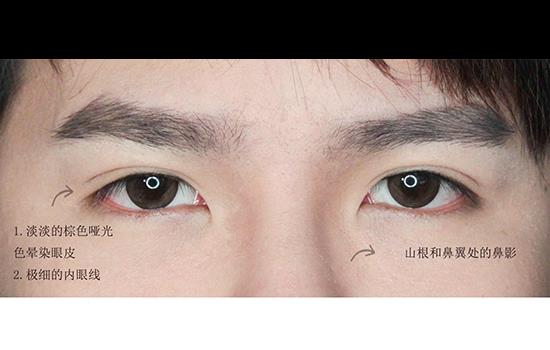 男生眼睛想要看起来有神一点,可以选择用哑光棕色眼影或者眉粉扫在眼窝处,并选择眼线笔画好极细的内眼线。