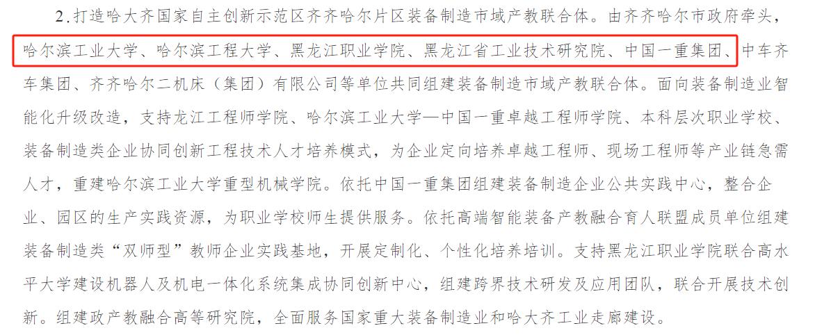 再看这则通知,明确指出依托相关高校打造齐齐哈尔片区装备制造市城产教联合体,其中有哈尔滨工业大学、哈尔滨工程大学、中国一重集团等单位,这些都是在重型机械领域拥有强大科研和产业能力的单位,相信有哈工大做背书,各重型机械单位的联合加盟,重建重型机械学院将会取得重要进展,也将会给东北老工业基地发展带来新的增长动能。