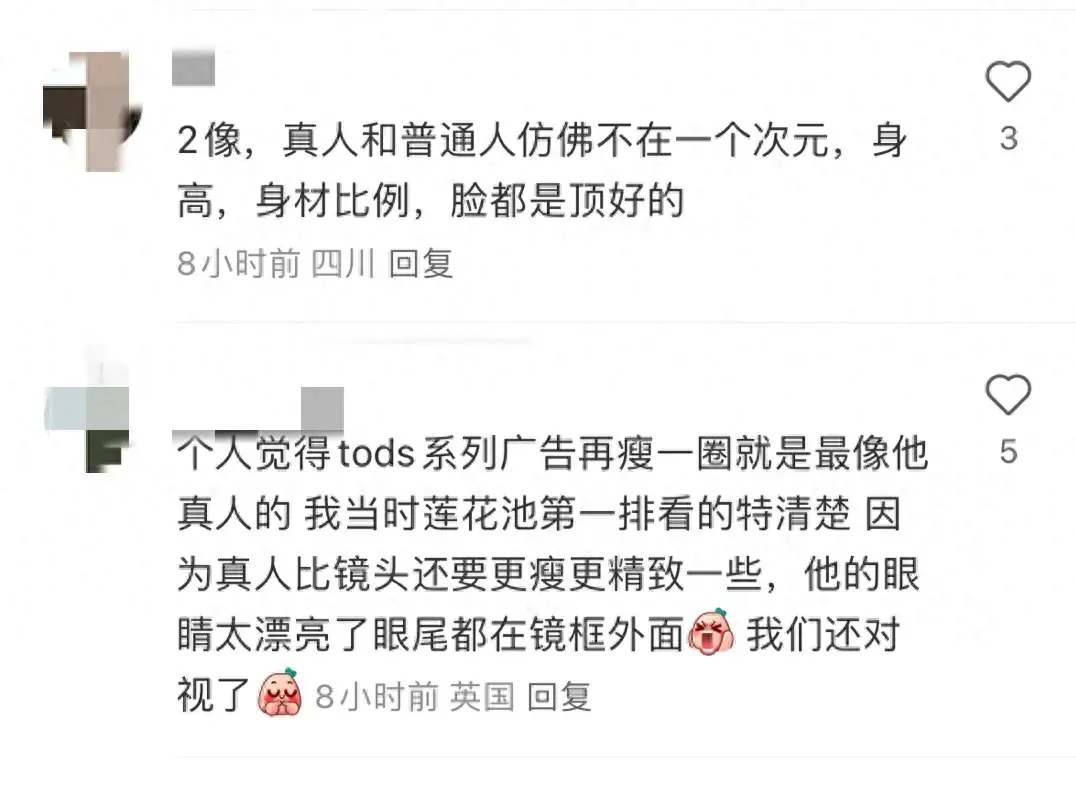 网友:“个人觉得TODS系列广告再瘦一圈就是最像他真人的。因为真人比镜头还要更瘦更精致一些,他的眼睛太漂亮了,眼尾都在镜框外面。”