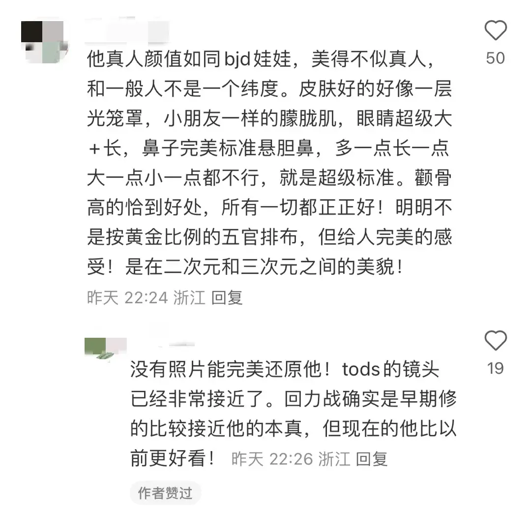 网友:“他真人颜值如同bjd娃娃,美得不似真人,和一般人不是一个纬度。皮肤好的像一层光笼罩,小朋友一样朦胧肌,眼睛超级大+长,鼻子完美标准悬胆鼻,多一点长一点小一点都不行,就是超级标准。颧骨高的恰到好处,所有一切都正好!是二次元和三次元之间的美貌。”