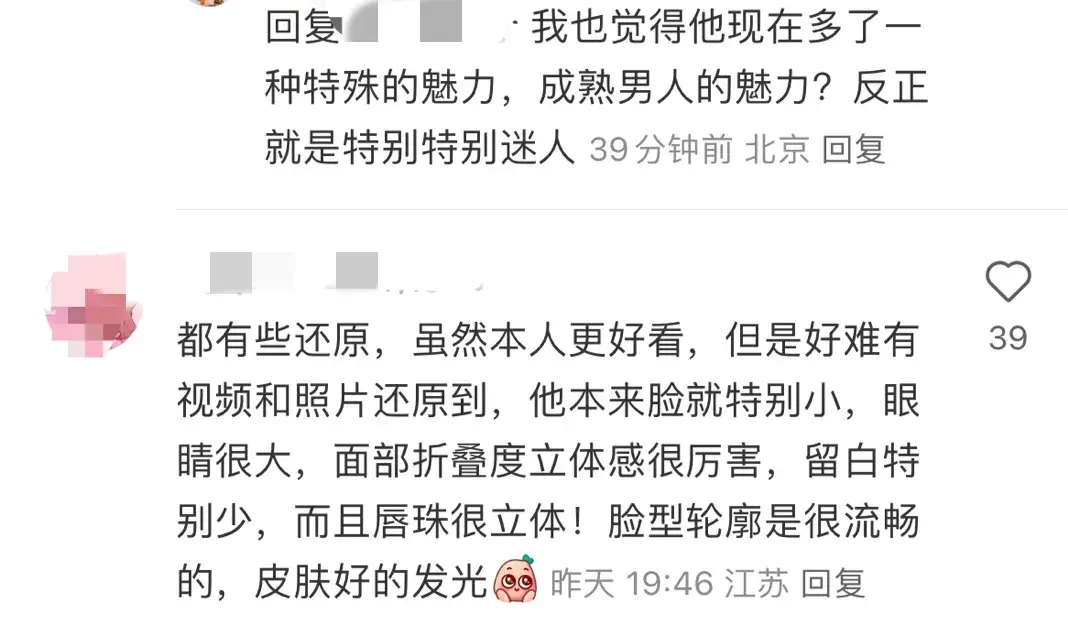 网友:“虽然本人更好看,但是好难有视频和照片还原到,他本来脸就特别小,眼睛大,面部折叠度立体感很厉害,留白特别少,而且唇珠很立体,脸型轮廓流畅,皮肤好的发光。”
