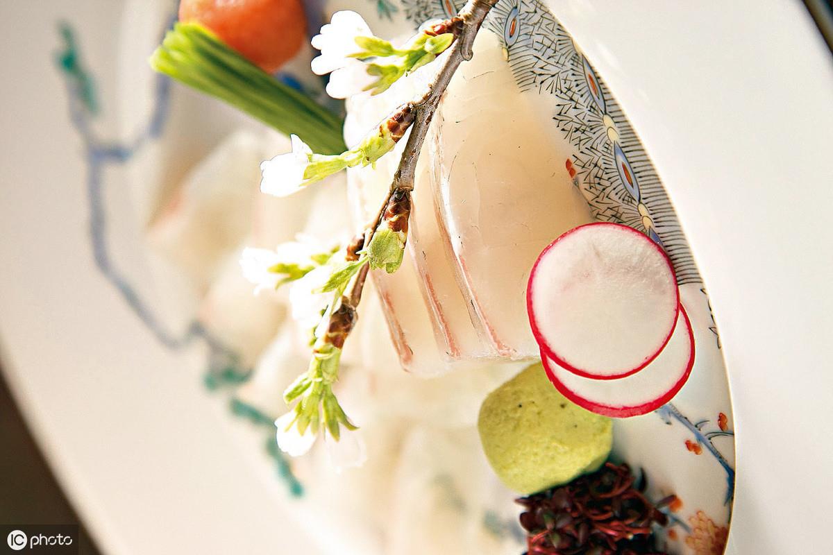 日本料理本身就可以称得上是艺术。有人说,吃日本料理,一半是吃环境、氛围和情调。的确如此,日本料理对食物形与色的高度讲究甚至可以体现在盛装食物这个细节上。相较于中餐里的“装盘”,和食的“盛付”其实更像是一门体现美学修养的摆放艺术,而最能体现这一点的,大概就是“刺身”了。据天保末期介绍江户时代风俗的随笔集《守贞漫稿》记载——“刺身”的“盛付”讲究一种山水的感觉,如在平坦的大盘中,用切成细丝的萝卜在左前方隆起地堆成小山状,上置一片青绿色的紫苏,旁边插放一支植物,便可使人联想起苍翠的远山。再将切成花色的鱿鱼、切成薄片的鲷鱼排放在其下, 犹如潺潺流水。或者再配放几枚红色的金枪鱼,置一朵黄菊,色彩极为悦目。