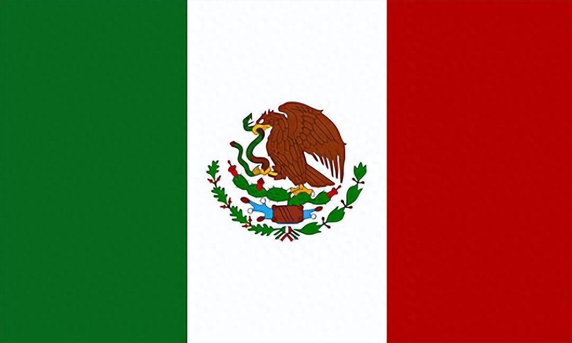 墨西哥国旗由绿、白、红三个相等垂直长方形构成。在中间白色长方形内有一只鹰停留在仙人掌上吃蛇的图案。传说曾有神灵托梦给墨西哥人的祖先说只要见到鹰叼着蛇站在仙人掌上就在那地方定居下来。墨西哥人的祖先根据这一神谕找到了如今的墨西哥城。从此鹰吃蛇的图案即成为墨西哥的民族象征。此外国旗中的绿色象征国家独立、白色象征和平、红色象征国家的统一。