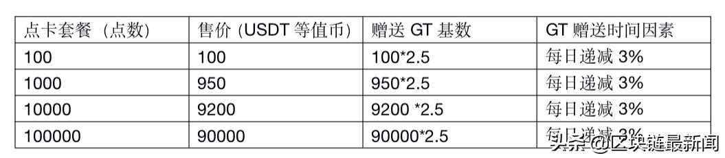 GT分发第一阶段(一周):点卡赠送,总量上限1.5亿枚GT,每支付1USDT购买点卡赠送2.5GT,每日递减3%