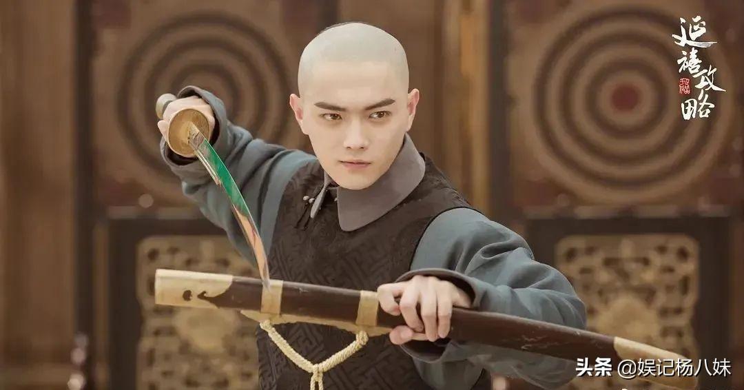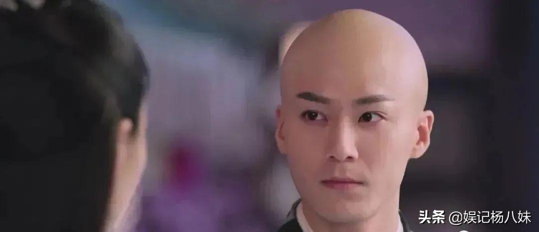 杨祐宁的光头造型,从正面看像光头方块人,腮帮子明显,从侧面则是嘴突下巴尖,简直毫无古装美男应有的水准。