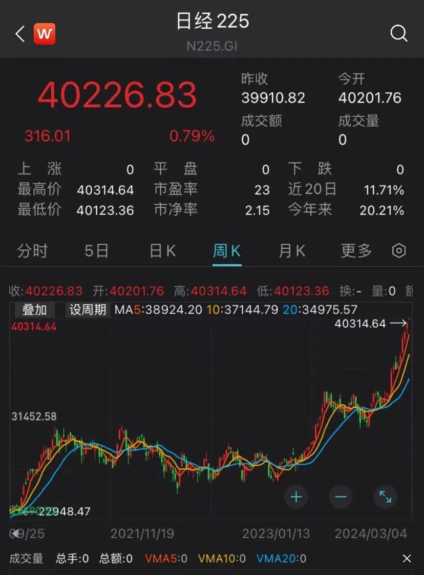 行情数据显示,日经 225 指数在周一跳空高开近 1%,一举逾越 4 万点关口,最高攀升至 40314.64 点。包括芯片制造设备生产商东京电子在内的科技股盘中继续上涨,这些股票在过去一年中不断帮助推动了股指的上扬。