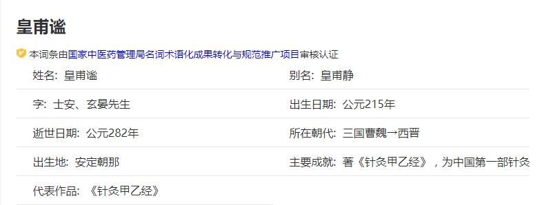 皇甫谧(215年-282年),幼名静,字士安,自号玄晏先生。安定郡朝县(今甘肃省平凉市灵台县朝那镇)人。三国西晋时期学者、医学家、史学家,东汉名将皇甫嵩曾孙。他一生以著述为业,后得风痹疾,犹手不释卷。晋武帝时累征不就,自表借书,武帝赐书一车。其著作《针灸甲乙经》是中国第一部针灸学的专著。其实,除此之外,他还编撰了《历代帝王世纪》、《高士传》、《逸士传》、《列女传》、《元晏先生集》等书。在医学史和文学史上都负有盛名。在针灸学史上,占有很高的学术地位,并被誉为“针灸鼻祖”。挚虞、张轨等都为其门生。