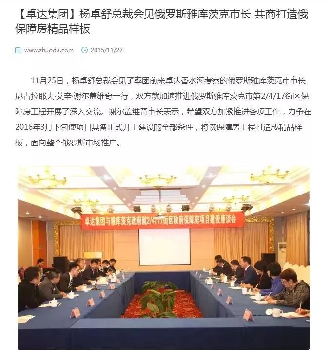 当然有人会说卓达还有俄罗斯的项目,我们顺便来看看俄罗斯项目是怎么回事。据杨卓舒自己说,他的名字卓舒,就是卓娅舒拉,杨对苏联和俄罗斯总有那么一种奇妙的情愫。卓达在俄罗斯的公司全称为卓达俄罗斯投资公司。实际一点都没投资。 卓达的套路一直都是野路子,不按照正规的来。比如在俄罗斯注册公司,法人是他儿子杨汗青,总经理是闫占富,而公司的运营资金竟然是卓达通过自己的员工携带出境的,所以卓达对俄罗斯项目的投资没有任何的银行记录可查,甚至有转移财产的嫌疑。这些人的费用卓达是纯投入,没有任何销售和项目收入来回报。 在俄罗斯的员工呢,多则一两年,少则几个月都走了,流动性很大。不乏有经验之人,最终都是因为无事可做加上忽悠被忽悠流动了。留下来的都是混日子的及庸才,在外面不好找工作的。整个桌达都是如此,人力成本收不回来。