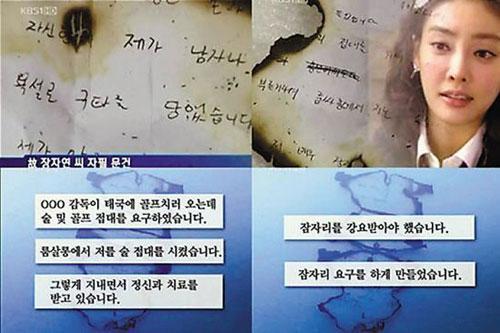指控31位权贵的遗书,并不是一开始就被公诸于众,而是张紫妍死后两年才被电视台曝光。先是在2011年3月,韩国SBS电视台公开权贵名单遗书。到了同年年底则是有50多封的亲笔信公开,说是张紫妍生前写给朋友的诀别信。字字句句都揭露着韩国娱乐圈的肮脏黑幕。详细到连时间、地点、人物都写得清清楚楚。