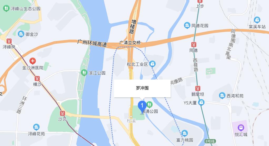 位于白云区西南端的罗冲围,地处金沙洲与同德围之间,临近北环高速公路、广清高速连接线和内环路等城市干道,是西联佛山北接清远东临主城的交通枢纽。