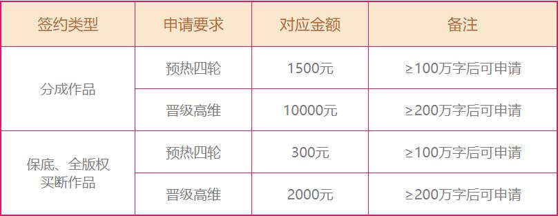 作品字数达到60万字以上即可申请,申请成功后次月随稿费发放。