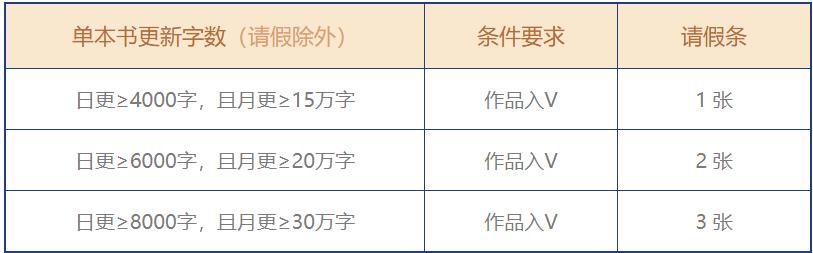 签约作品可用请假条请假,请假条仅限于单本书使用,1张请假条可以请假1天,每月最多累计请假2次,且不得连续使用。