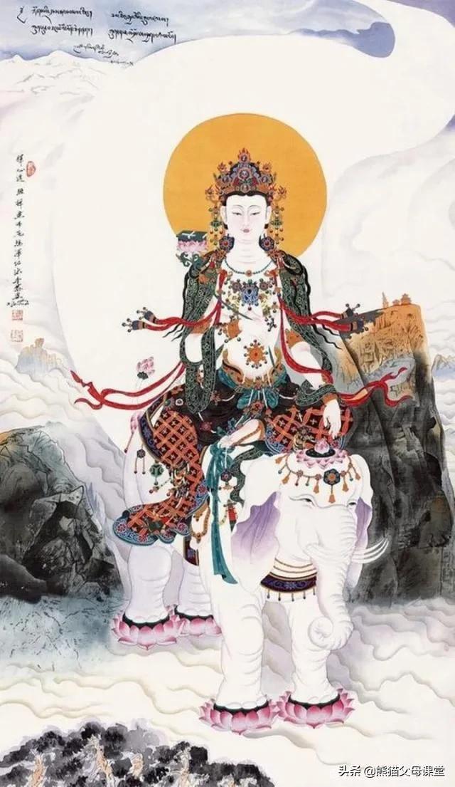 普贤菩萨,象征修行广大和功德圆满。坐骑六牙白象,道场峨嵋山。