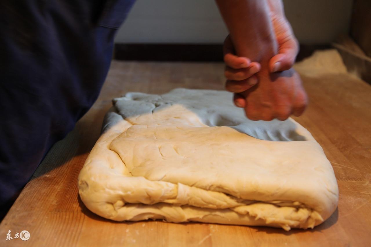 4、将面团搓成长条状,分成10等份,用手压扁。