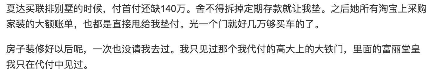 姚非拉还称,夏达买房自己垫付了140万,指出夏达购买的是联排别墅。但夏达随即辩解自己在杭州的两套房总价100多万(杭州房价这么便宜?)。