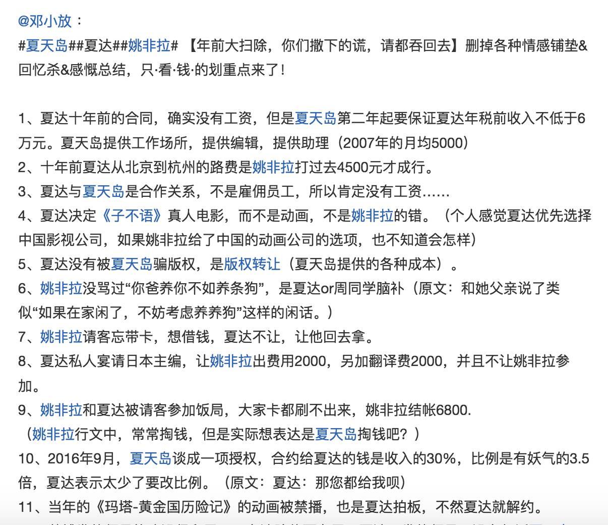 1月26号,夏达发布《辞旧迎新,好好过年。》,赶在年前对姚非拉上一篇长微博《【年前大扫除:你们撒下的谎,请都吞回去吧】》作了阶段性反驳,包括自己买的不是联排别墅,姚老师吃饭不带钱找人借,还不还饭钱等等。生活细节吃瓜群众还是爱看的,不过就是感觉缺少了点新意。