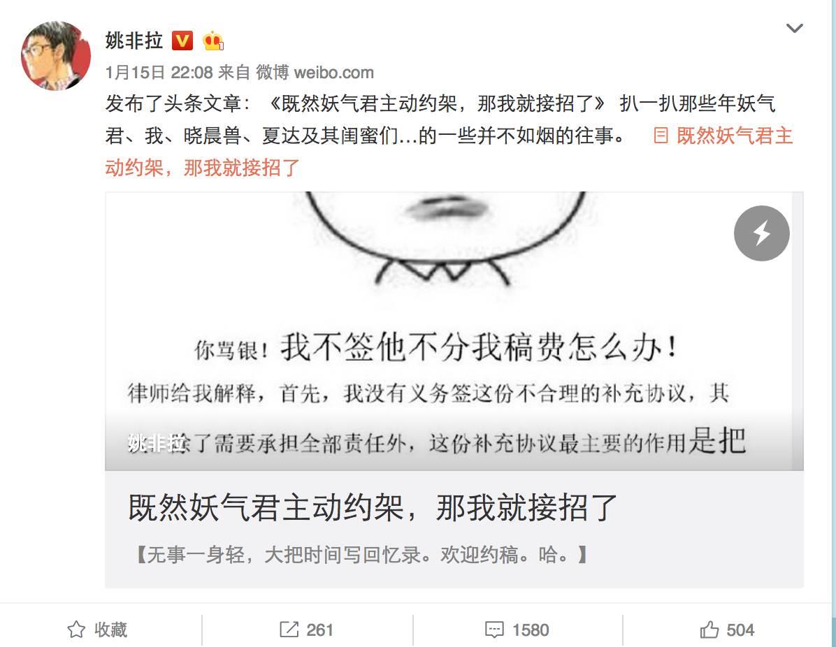 1月15日,姚非拉《既然妖气君主动约架,那我就接招了》一文,就夏天岛、漫画家晓晨兽、有妖气的三角关系爆料,称有妖气利用和漫画家晓晨兽的关系,逼迫夏天岛签订零成本授权的动画改编合同,却让夏天岛单方面被指责,还指责对方只说不做,动画改编运营不力,只做宣传,没有成品。