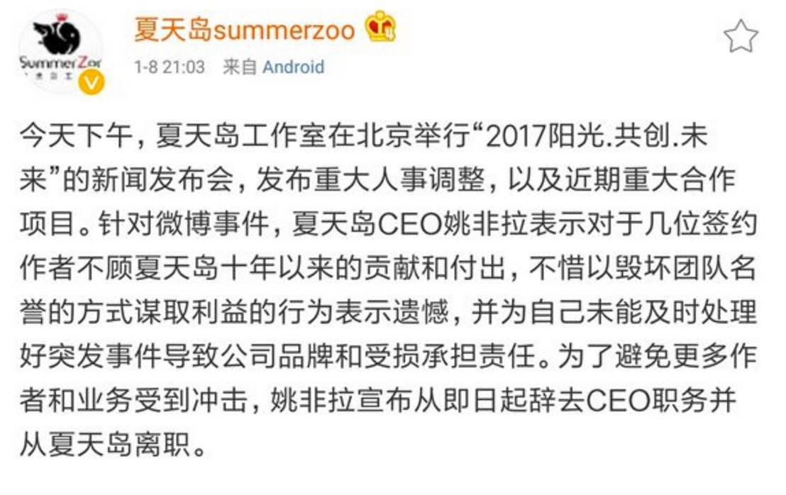 1月8日,姚非拉召开新闻发布会宣布离职夏天岛。但事态并未得到缓解,姚非拉看似彻底让步的一招棋,不仅没在舆论层面激起多大水花,还让对手更加不依不饶。
