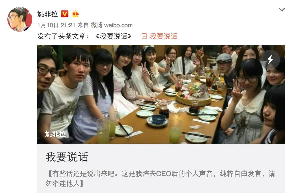 就连姚非拉本人也表示,辞去ceo是为了“更好说话”,并就此事于1月10号发表长微博《我要说话》。看行文意思,是准备全身心投入撕逼:“我就是不服,我要继续说话。”