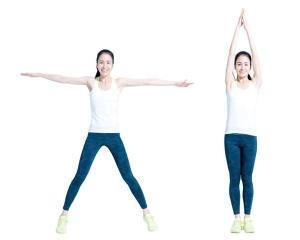 这个动作很简单,只需要大家先站直了之后,双脚打开的同时把手臂打开,在自己的头顶击掌,然后三角恢复到原来并拢的状态时,跳起来,让手臂恢复到原来在身体的两侧,也就是说,恢复到原来直立的状态。这样循环往复30个,比较有助于燃烧脂肪的。