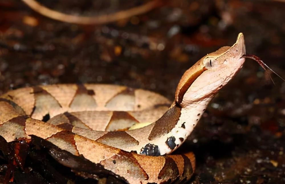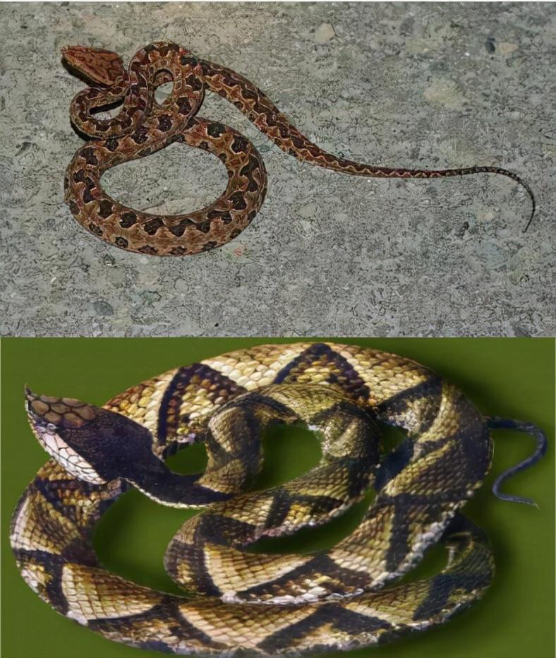 其实尖吻蝮身上的花纹是三角形的,而原矛头蝮的是圆形的。尖吻蝮的吻部明显比较尖,而且上面还有小肉芽,但原矛头蝮的吻部比较钝,所以两者还是有不少明显的差别的。不过随着年龄的增长,尖吻蝮的吻部会越来越圆润。