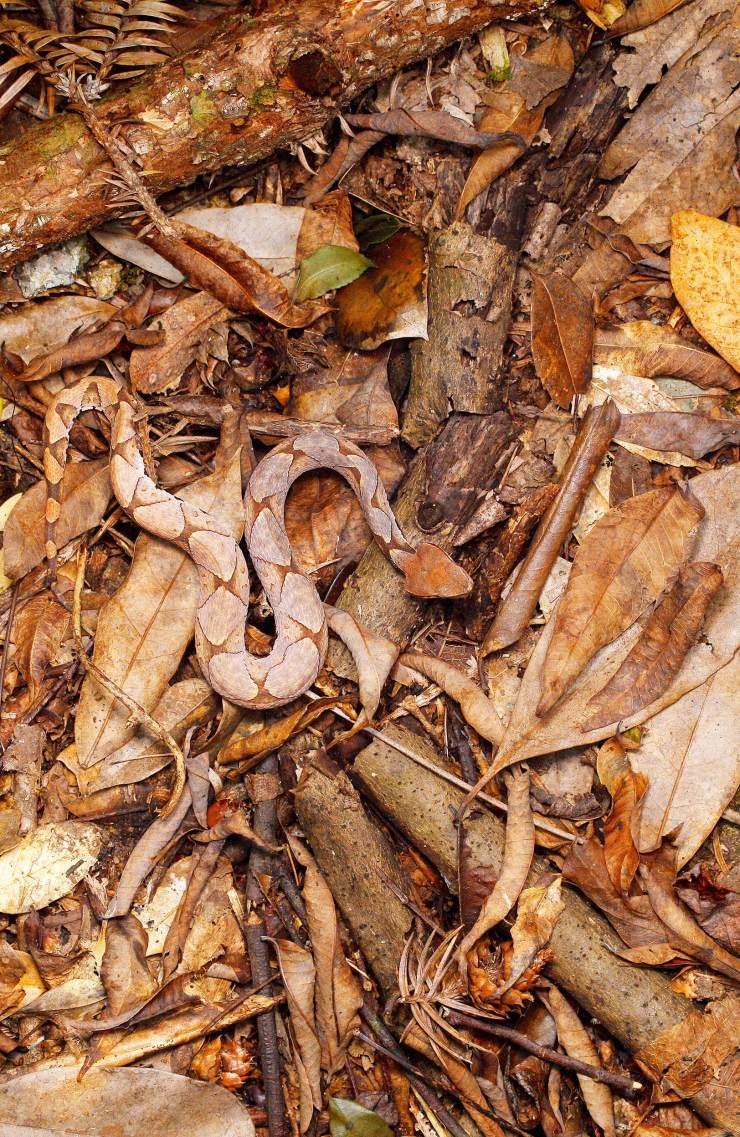 成年的尖吻蝮能长到91-121厘米,据说目前最长的记录是154.5厘米。它们的身体大多数是棕色或者灰色的,再加上颜色较浅的三角形棕灰色花纹,形成了很好的保护色,可以轻易地藏身在枯木败叶里。