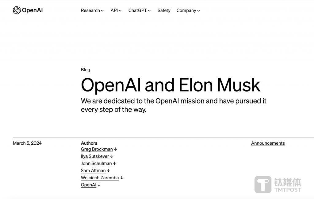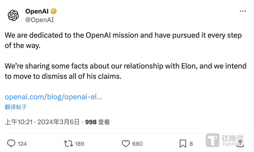 钛媒体 App 获悉,北京时间 3 月 6 日上午 10 点 21 分,OpenAI 公司发布推文和博客文章,分享与特斯拉 CEO、OpenAI 联合创始人马斯克(Elon Musk)的邮件、时间脉络等重要关系事实,并宣布计划驳回其所有主张。