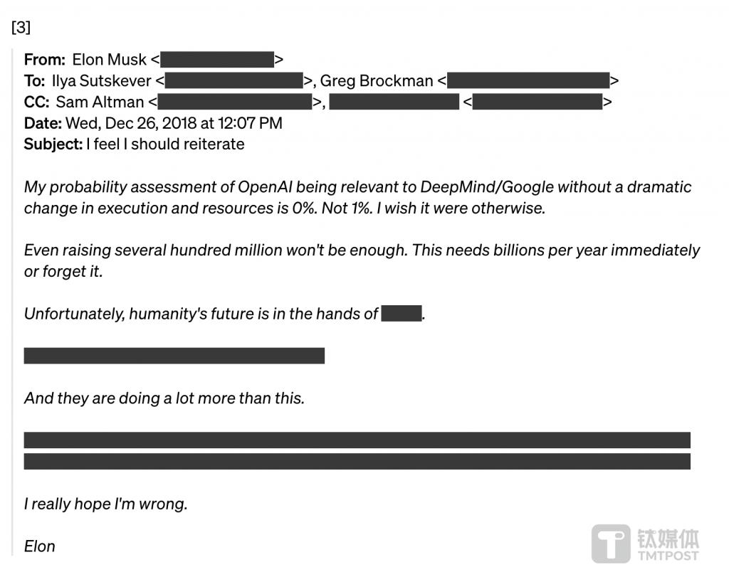 OpenAI 指出,2015 年底创办 OpenAI 时,Greg 和 Sam 最初计划筹集 1 亿美元。马斯克在一封电子邮件中表示:" 我们需要提供比 1 亿美元更多的资金,以避免听起来绝望……我认为我们应该说我们从 10 亿美元的资金承诺开始……我将承担其他人没有提供的任何资金 "。