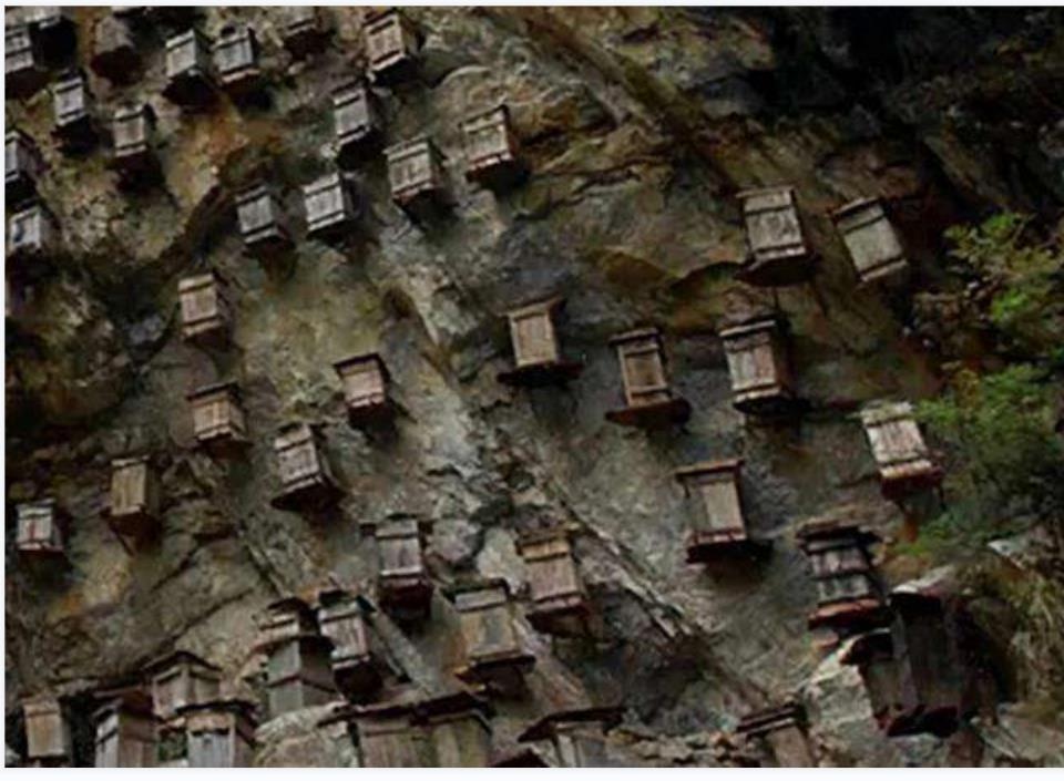 在贵州格凸河畔,最著名的崖葬地点就是燕子洞。这是一个巨大的溶洞,河水从洞中穿流而过,洞内终年生活聚集着成千上万只燕子。在燕子洞的悬崖两边,堆放着许许多多古老破旧的棺材,层层叠叠,触目惊心。这些棺材都是背尸人一代代将逝者送上去的。